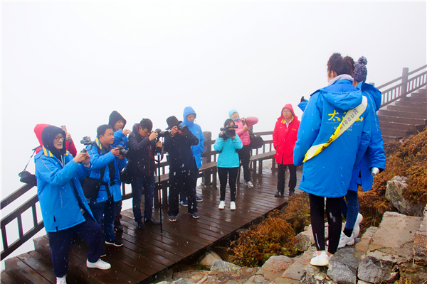 10月6日,海拔3511米的天圆地方景点飘起了雪花,给秋意正浓的太白山又增添了些许的靓丽。与此同时,2018世界旅游小姐年度皇后比赛的选手也走进太白山,来感受这里秋雪点缀秋景的独特美景。
