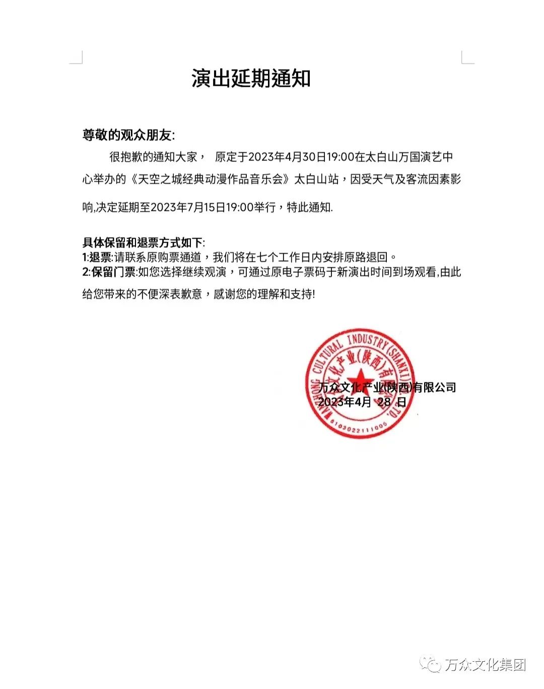 太白山《天空之城经典动漫作品音乐会》延期通知